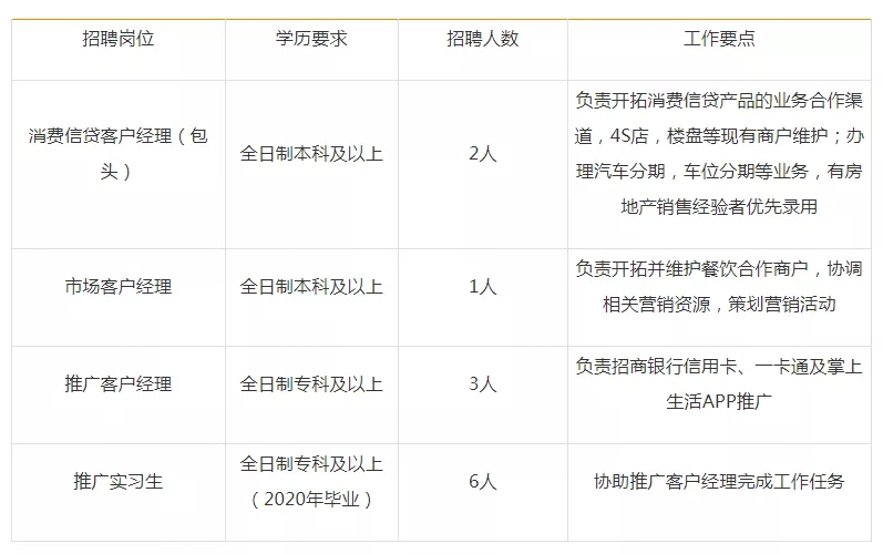 2019招商銀行內(nèi)蒙古呼和浩特信用卡部招聘12人,簡歷投遞郵箱:litingting_hhht@cmbchina.com,現(xiàn)將招聘公告原文發(fā)布如下: