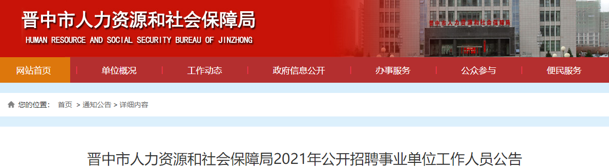 為進(jìn)一步加強(qiáng)事業(yè)單位工作人員隊(duì)伍建設(shè),根據(jù)《事業(yè)單位人事管理?xiàng)l例》和我省《關(guān)于進(jìn)一步改進(jìn)和加強(qiáng)事業(yè)單位公開招聘工作的意見》(晉人社廳發(fā)〔2017〕35號(hào))、《關(guān)于做好2021年全省事業(yè)單位公開招聘工作的通知》(晉人社廳發(fā)〔2021〕17號(hào))等政策規(guī)定和要求,結(jié)合2021年度事業(yè)單位公開招聘人員計(jì)劃,晉中市人力資源和社會(huì)保障局計(jì)劃組織實(shí)施2021年事業(yè)單位公開招聘工作人員工作,現(xiàn)將有關(guān)事項(xiàng)公告如下: