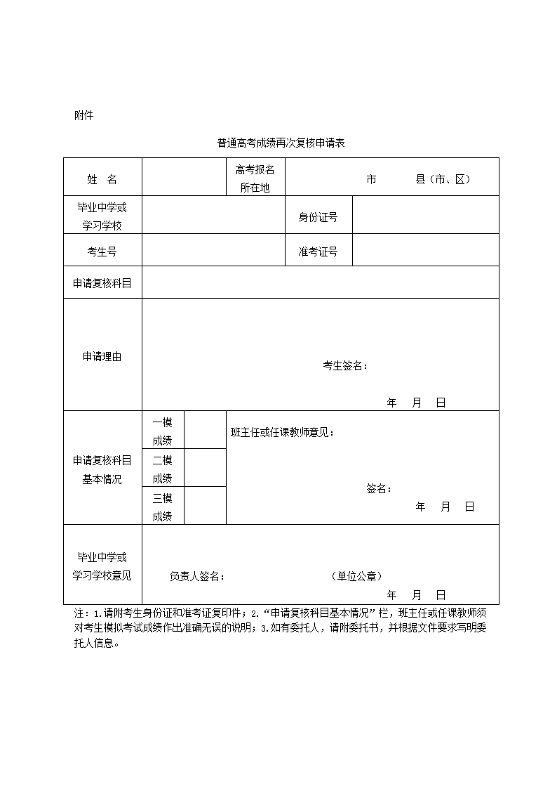 第八條考生對首次復(fù)核結(jié)果仍存有異議的,可于第一階段填報志愿截止前,向所在中學(xué)或報名點提交《普通高考成績再次復(fù)核申請表》(見附件),按科目提出再次復(fù)核申請,申請表須經(jīng)班主任或相關(guān)科目任課教師審核簽名,并經(jīng)所在中學(xué)或?qū)W習(xí)學(xué)校負責(zé)人簽名確認并加蓋公章。各縣(市、區(qū))、設(shè)區(qū)市招辦逐級匯總后報省教育考試院。手續(xù)不齊全的,不接受其再次復(fù)核申請。