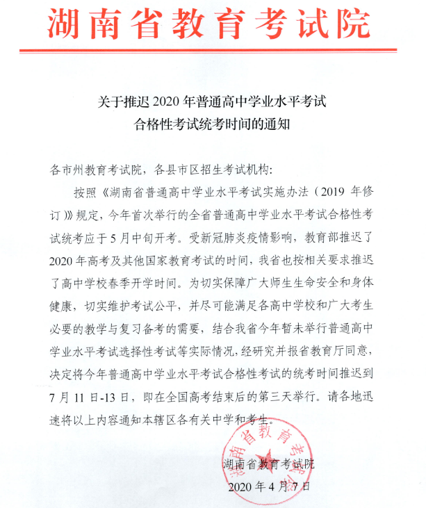 會(huì)考頻道從湖南教育考試院了解到,湖南2020年普通高中學(xué)業(yè)水平合格性考試時(shí)間推遲,推遲到7月11日-13日,具體如下: