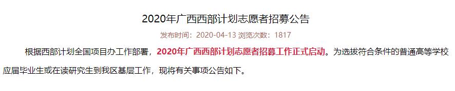 根據(jù)西部計劃全國項目辦工作部署,2020年廣西西部計劃志愿者招募工作正式啟動。為選拔符合條件的普通高等學(xué)校應(yīng)屆畢業(yè)生或在讀研究生到我區(qū)基層工作,現(xiàn)將有關(guān)事項公告如下。