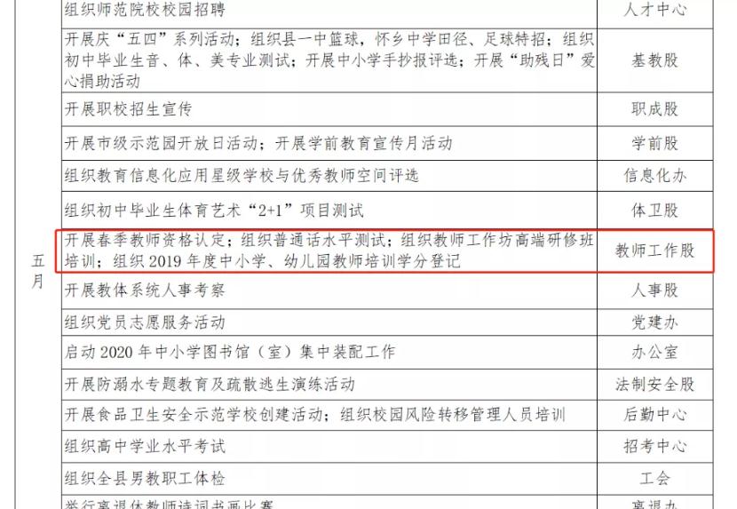 湖南省華容縣教育體育局官方發(fā)布的關(guān)于印發(fā)《華容縣教育體育局2020年工作要點(diǎn)》的通知提到:華容縣教育體育局將于5月開展春季教師資格認(rèn)定;組織普通話水平測(cè)試工作。