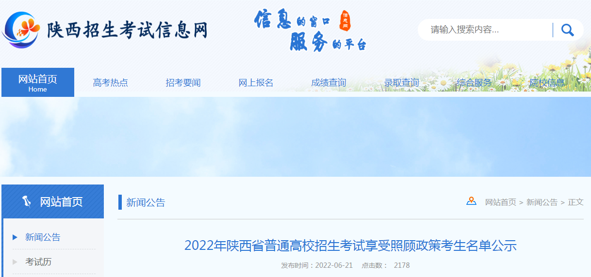 從陜西招生考試信息網(wǎng)了解到,2022年陜西省普通高校招生考試享受照顧政策考生名單公示已發(fā)布,詳細內(nèi)容如下: