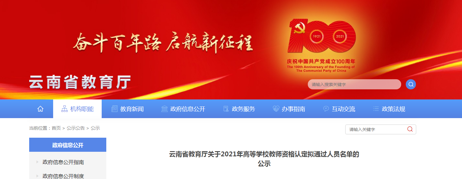 按照《云南省教育廳關(guān)于開(kāi)展2021年高等學(xué)校教師資格認(rèn)定工作的通知》要求,省教育廳已完成2021年高等學(xué)校教師資格認(rèn)定材料審核工作,現(xiàn)將擬通過(guò)人員名單予以公示,公示時(shí)間為5個(gè)工作日(2021年6月29日至7月5日)。