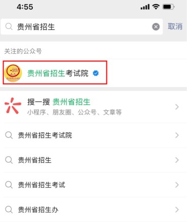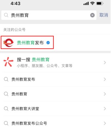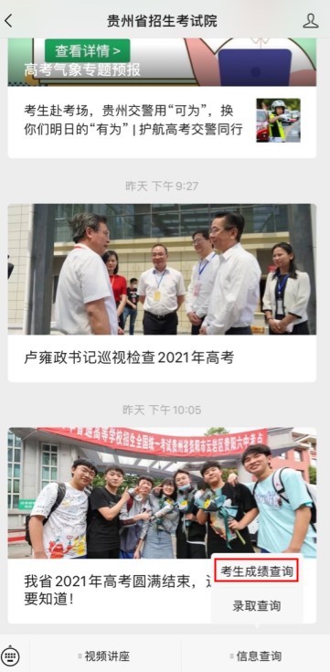 2、關(guān)注貴州省教育廳政務(wù)微信“貴州教育發(fā)布”(guizhou_edu),進入微信下方菜單欄“貴州高考”請考生耐心等待高考成績查詢?nèi)肟凇?BR>