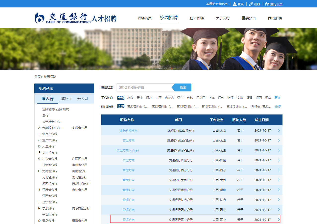 2022交通銀行山西晉中分行校園招聘信息已發(fā)布,報(bào)名時(shí)間:2021年10月17日截止,現(xiàn)將招聘詳情發(fā)布如下: