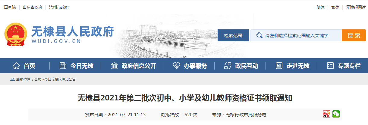 從無棣縣人民政府獲悉,2021山東濱州市無棣縣初中、小學(xué)及幼兒教師資格證書領(lǐng)取通知(第二批次)已公布,請相關(guān)人員仔細(xì)閱讀,具體詳情如下: