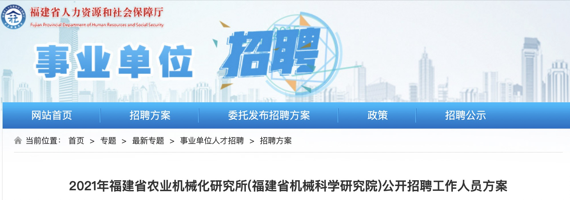 2021年福建省農(nóng)業(yè)機(jī)械化研究所事業(yè)編制工作人員招聘公告【15人】已發(fā)布,網(wǎng)絡(luò)報名時間為:2021年8月14日至2021年8月20日,現(xiàn)將招聘公告原文發(fā)布如下: