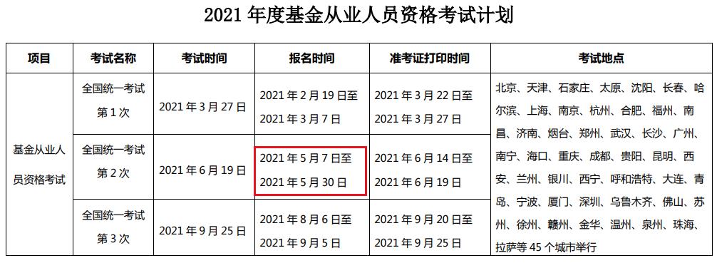 根據(jù)“中國(guó)證券投資基金業(yè)協(xié)會(huì)關(guān)于發(fā)布2021年度考試計(jì)劃的通知”得知,2021年基金從業(yè)人員資格考試擬在全國(guó)45個(gè)城市舉辦3次。其中,2021年天津第二次基金從業(yè)資格報(bào)名時(shí)間為2021年5月7日至5月30日。屆時(shí),考生可在規(guī)定的報(bào)名時(shí)間內(nèi)通過(guò)中國(guó)證券投資基金業(yè)協(xié)會(huì)進(jìn)行報(bào)名,詳細(xì)內(nèi)容如下: