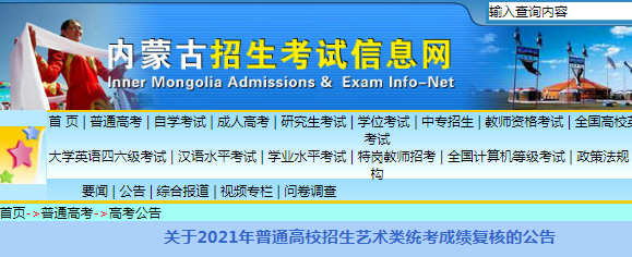 從內(nèi)蒙古招生考試信息網(wǎng)了解到,2021年內(nèi)蒙古普通高校招生藝術(shù)類統(tǒng)考成績復(fù)核的公告已經(jīng)發(fā)布,為方便考生了解情況,現(xiàn)將有關(guān)事宜通知如下: