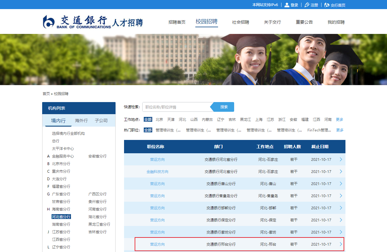 2022交通銀行河北邢臺分行校園招聘信息已發(fā)布,報名時間:2021年10月17日截止,現(xiàn)將招聘詳情發(fā)布如下: