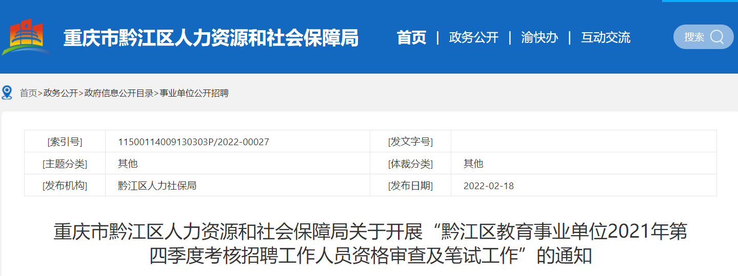 2021年第四季度重慶黔江區(qū)教育事業(yè)單位考核招聘工作人員資格審查及筆試工作通知已發(fā)布,資格審查時(shí)間:2022年2月25日上午9:00-12:00,下午14:00-17:00。現(xiàn)將原文發(fā)布如下: