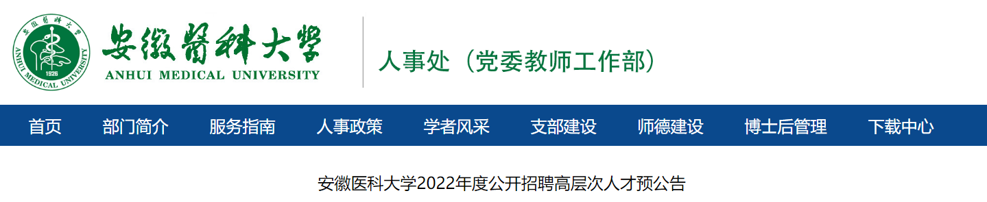 為做好2022年度安徽醫(yī)科大學(xué)人才公開招聘工作,根據(jù)《事業(yè)單位人事管理條例》(國務(wù)院令第652號)和中共安徽省委組織部、安徽省人力資源社會保障廳《關(guān)于印發(fā)〈安徽省事業(yè)單位公開招聘人員暫行辦法〉的通知》(皖人社發(fā)〔2010〕78號)規(guī)定,現(xiàn)有關(guān)事項公告如下: