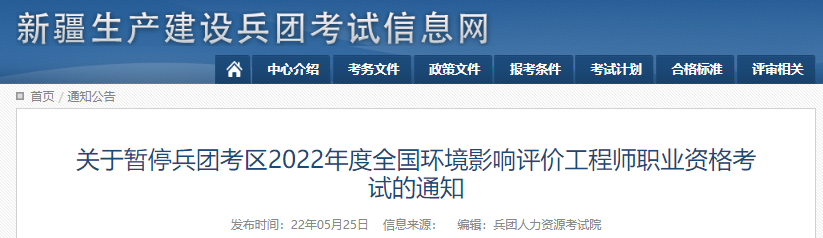 關(guān)于暫停兵團(tuán)考區(qū)2022年度全國環(huán)境影響評價工程師職業(yè)資格考試的通知