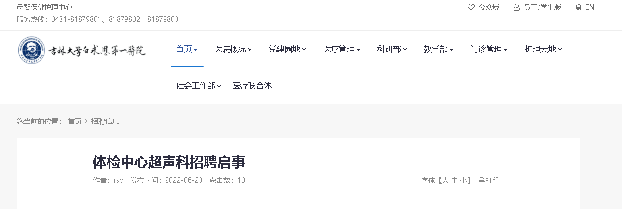 2022年吉林大學第一醫(yī)院體檢中心超聲科招聘,報名時間:2022年6月30日下午4:00截止,現將招聘啟事原文發(fā)布如下: