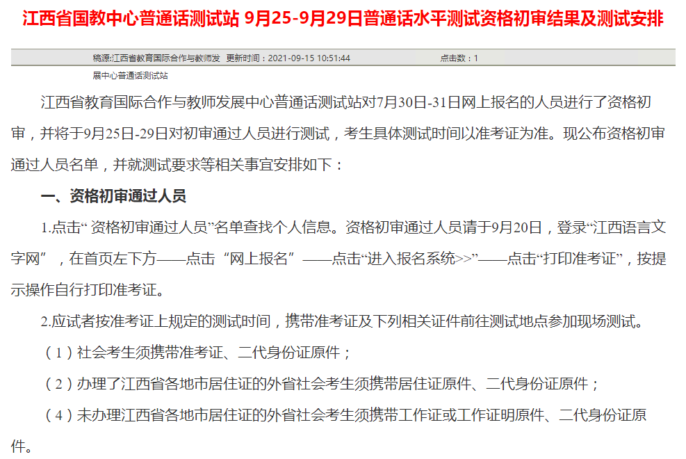 從江西省教育國際合作與教師發(fā)展中心普通話測試站了解到,江西省教育國際合作與教師發(fā)展中心普通話測試站對7月30日-31日網(wǎng)上報名的人員進行了資格初審,并將于9月25日-29日對初審通過人員進行測試,考生具體測試時間以準考證為準?,F(xiàn)公布資格初審通過人員名單,并就測試要求等相關事宜安排如下: