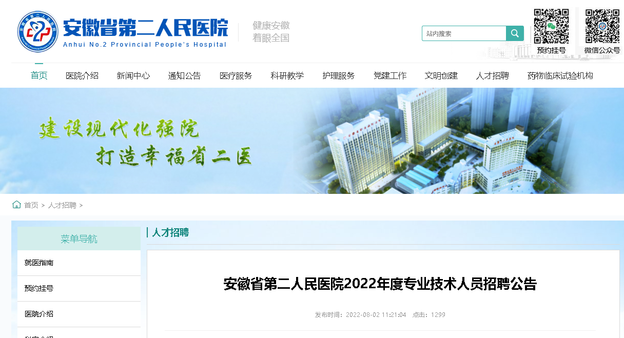 2022年安徽省第二人民醫(yī)院專(zhuān)業(yè)技術(shù)人員招聘22人,詳細(xì)請(qǐng)見(jiàn)公告內(nèi),現(xiàn)將招聘公告原文發(fā)布如下: