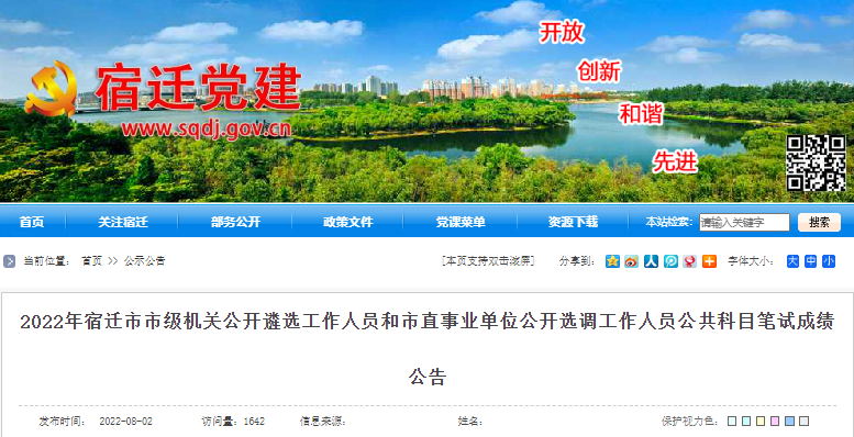 2022年宿遷市市級(jí)機(jī)關(guān)公開(kāi)遴選工作人員和市直事業(yè)單位公開(kāi)選調(diào)工作人員公共科目筆試閱卷工作已經(jīng)結(jié)束,報(bào)考人員可登陸報(bào)名網(wǎng)站查詢個(gè)人成績(jī)及排名。