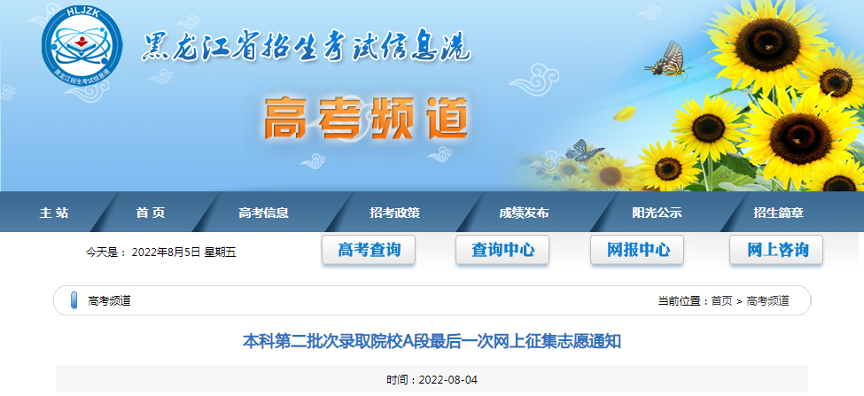 從黑龍江省招生考試信息港了解到,2022年黑龍江本科第二批次錄取院校A段最后一次網(wǎng)上征集志愿通知已發(fā)布,詳細(xì)內(nèi)容如下:
