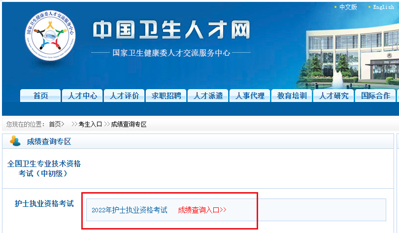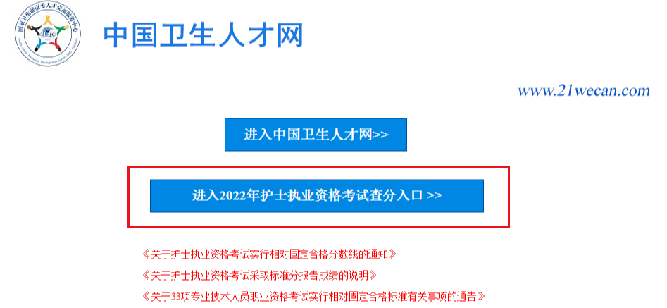 1、登錄“中國衛(wèi)生人才網(wǎng)”網(wǎng)站,點(diǎn)擊“進(jìn)入2022年護(hù)士執(zhí)業(yè)資格考試查分入口”。