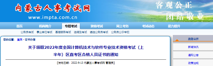 2022年度全國計(jì)算機(jī)技術(shù)與軟件專業(yè)技術(shù)資格考試(上半年)合格人員成績已經(jīng)公布,區(qū)直考區(qū)合格人員請(qǐng)于2022年9月14日——16日到內(nèi)蒙古自治區(qū)人事考試院二樓大廳(地址:呼和浩特市金橋開發(fā)區(qū)包頭大街原世紀(jì)五路)領(lǐng)取證書。領(lǐng)取時(shí)需攜帶本人準(zhǔn)考證、身份證,代領(lǐng)證書需攜帶考生本人準(zhǔn)考證、身份證及代領(lǐng)人身份證、身份證復(fù)印件。(區(qū)直考生郵寄郵箱nmgrskszxzs@163.com請(qǐng)寫明:報(bào)考名稱,報(bào)名審核點(diǎn),考生姓名,聯(lián)系電話,收件地址,身份證號(hào),請(qǐng)考生不要重復(fù)發(fā)郵寄信息)。申請(qǐng)郵寄的考生,請(qǐng)耐心等待,我們會(huì)在集中發(fā)放證書后5-10個(gè)工作日郵寄。
