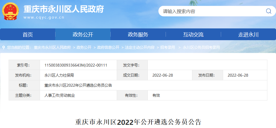 2022年重慶市永川區(qū)公開遴選公務(wù)員公告已公布,為了方便廣大考生的查閱,下面為您詳細(xì)介紹一下本次遴選公務(wù)員的具體事宜,希望廣大考生及時關(guān)注,如有相關(guān)疑問,請關(guān)注遴選考試頻道為您實時做出的更新。