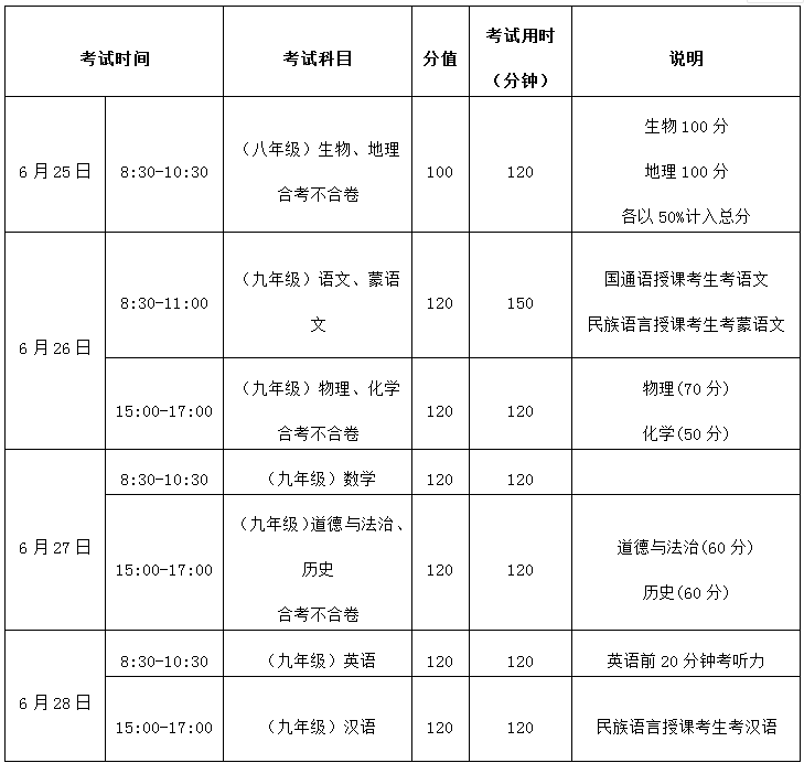 2022年內(nèi)蒙古通遼中考時(shí)間為6月26日-6月28日,具體考試時(shí)間安排如下