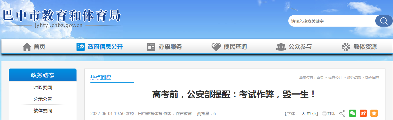從巴中市教育和體育局了解到,2022年高考前,公安部提醒:考試作弊,毀一生!詳細(xì)內(nèi)容如下: