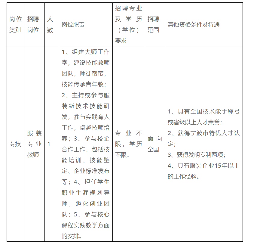 根據(jù)《寧波市事業(yè)單位公開招聘工作人員實(shí)施辦法》的有關(guān)規(guī)定,經(jīng)寧波市教育局同意,浙江紡織服裝職業(yè)技術(shù)學(xué)院決定面向全國(guó)公開招聘高層次高技能人才1名。現(xiàn)就有關(guān)事項(xiàng)公告如下: