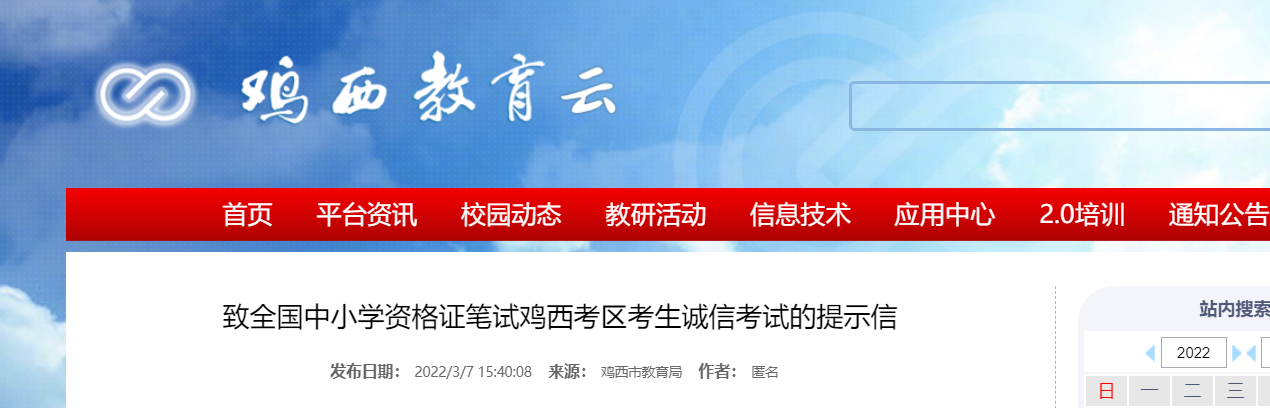 從雞西教育云獲悉,2022年黑龍江雞西全國中小學資格證筆試考試提示信已公布,請相關人員仔細閱讀,具體詳情如下: