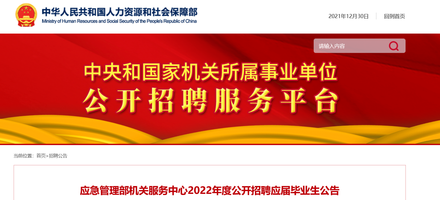 2022年應急管理部機關服務中心招聘應屆畢業(yè)生公告已發(fā)布。應急管理部機關服務中心是應急管理部所屬事業(yè)單位,主要承擔部機關的各項后勤服務和保障工作,受委托承擔部機關的部分行政事務性工作。根據工作需要,現計劃面向應屆畢業(yè)生招聘工作人員。為您整理了以下內容,供您參考。