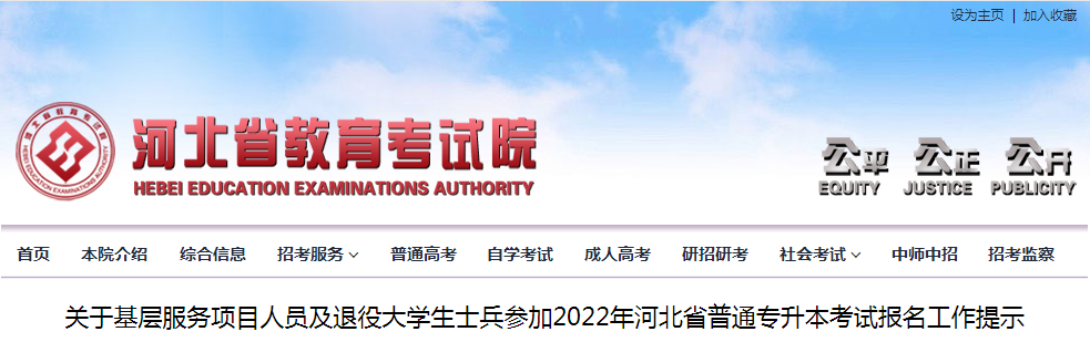 專升本頻道從河北省教育考試院了解到,關(guān)于基層服務(wù)項(xiàng)目人員及退役大學(xué)生士兵參加2022年河北省普通專升本考試報(bào)名工作提示資訊已發(fā)布,詳情如下: