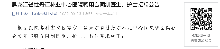 2022黑龍江省牡丹江林業(yè)中心醫(yī)院聘用合同制醫(yī)生、護(hù)士招聘47人,報(bào)名時(shí)間:2022年9月23日-2022年10月16日(每工作日早8點(diǎn)—晚5點(diǎn)),現(xiàn)將招聘公告原文發(fā)布如下: