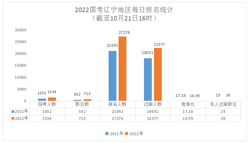 截至10月21日16時,2022國考職位中工作地點在遼寧的職位通過審核總?cè)藬?shù)為22377人,與去年相比增加4326人;共有30個職位無人通過審核,平均競爭比例為14.59:1,去年此時競爭比為17.16:1。下面是由為大家整理的2022國考遼寧報名人數(shù)統(tǒng)計,僅供參考,歡迎大家閱讀。