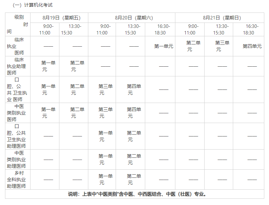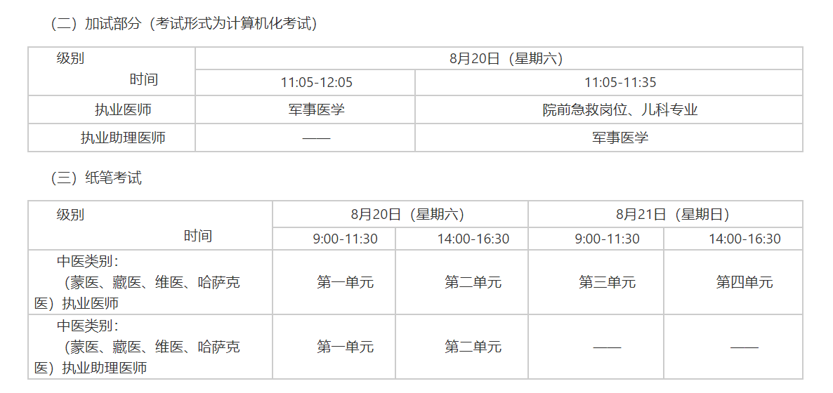 考試實(shí)行計(jì)算機(jī)化考試,軍隊(duì)現(xiàn)役人員加試軍事醫(yī)學(xué)、院前急救崗位和兒科專業(yè)加試相應(yīng)內(nèi)容。中醫(yī)類別蒙醫(yī)、藏醫(yī)、維醫(yī)、哈薩克醫(yī)專業(yè)實(shí)行紙筆考試。統(tǒng)一考試時(shí)間如下: