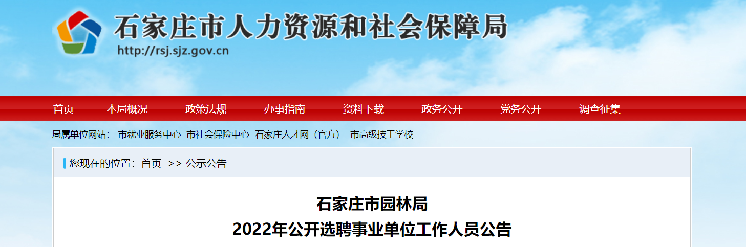 本次選聘通過(guò)石家莊市人力資源和社會(huì)保障局(http://rsj.sjz.gov.cn)、石家莊人事考試網(wǎng)(https://sjz.appms.cn)和石家莊市園林局(http://ylj.sjz.gov.cn/)發(fā)布公告。