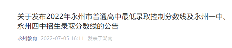 小編根據(jù)永州市教育局發(fā)布”關(guān)于發(fā)布2022年永州市普通高中最低錄取控制分?jǐn)?shù)線及永州一中、永州四中招生錄取分?jǐn)?shù)線的公告“得知,2022年湖南永州中考分?jǐn)?shù)線已公布,詳情如下: