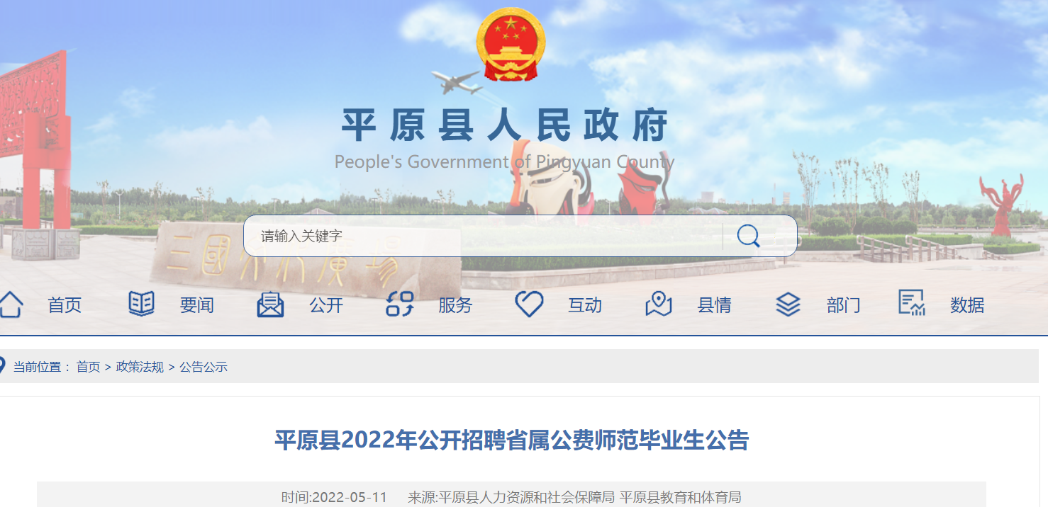 2022山東德州平原縣招聘省屬公費(fèi)師范畢業(yè)生82人,報(bào)名時(shí)間:2022年5月15日9:00—5月17日17:00?,F(xiàn)將招聘公告原文發(fā)布如下: