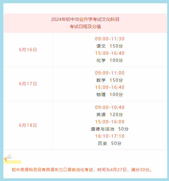 2024年全市初中畢業(yè)升學(xué)考試文化科目考試時(shí)間及分值正式公布。今年全市初中畢業(yè)升學(xué)考試文化科目考試時(shí)間為6月16日—18日,初二地理、生物考試時(shí)間為6月19日上午,其中地理考試時(shí)間為9:00— 10:00,生物考試時(shí)間為10:10—11:10。