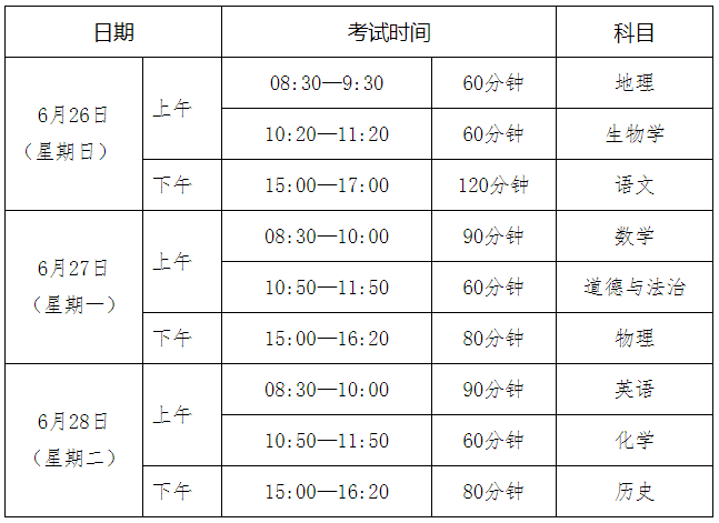 2022年廣東揭陽中考時(shí)間為6月26日-6月28日,具體考試時(shí)間安排如下: