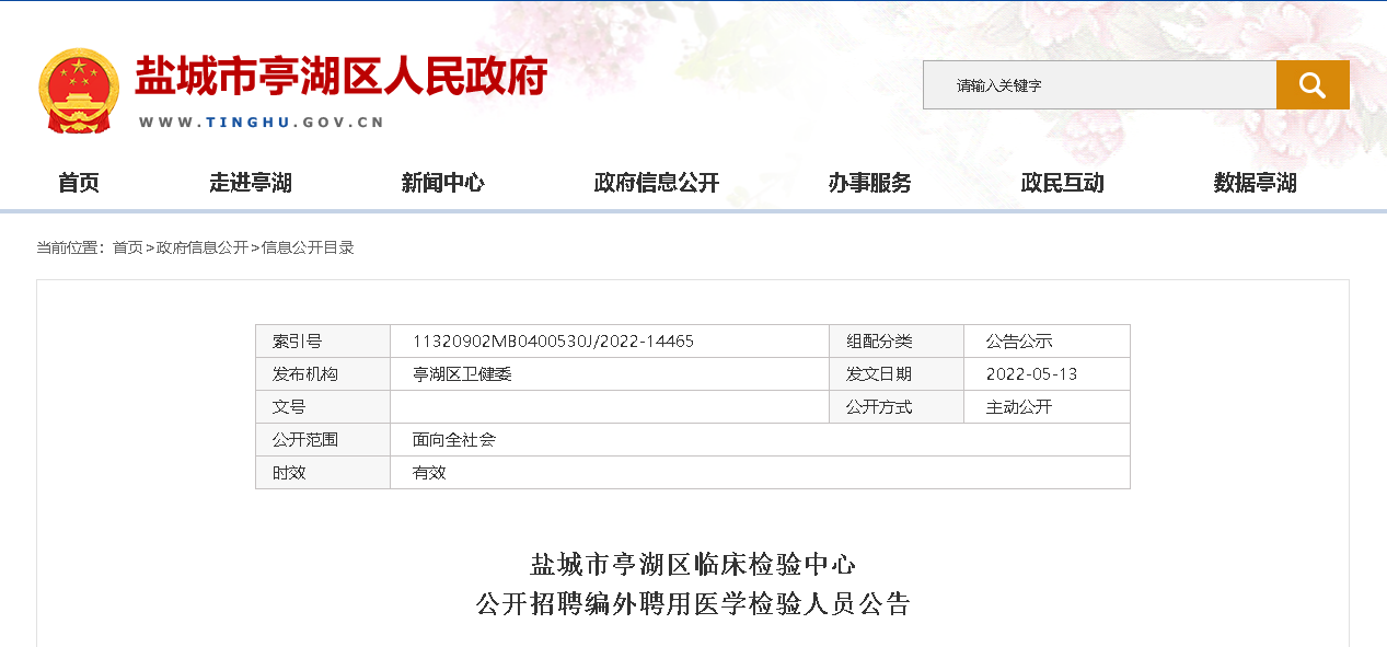 2022江蘇鹽城市亭湖區(qū)臨床檢驗(yàn)中心招聘編外聘用醫(yī)學(xué)檢驗(yàn)人員27人,報(bào)名時(shí)間:2022年5月19日--5月21日,上午8:30--12:00,下午2:30--18:00(周六不休息),現(xiàn)將招聘公告原文發(fā)布如下: