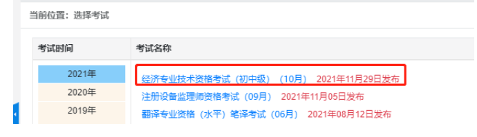 三、進(jìn)入系統(tǒng)后,選擇2021年經(jīng)濟(jì)專業(yè)技術(shù)資格考試(初中級)(10月),即可查詢考試成績。