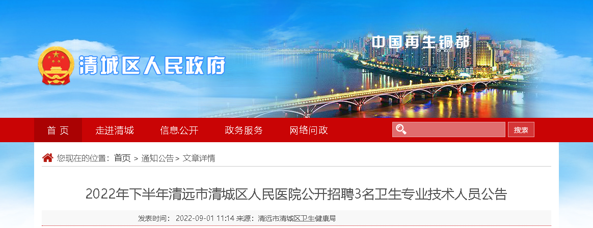 2022年下半年廣東清遠市清城區(qū)人民醫(yī)院招聘衛(wèi)生專業(yè)技術人員3人,報名時間:2022年9月19日9:00至9月23日16:00,現(xiàn)將招聘公告原文發(fā)布如下: