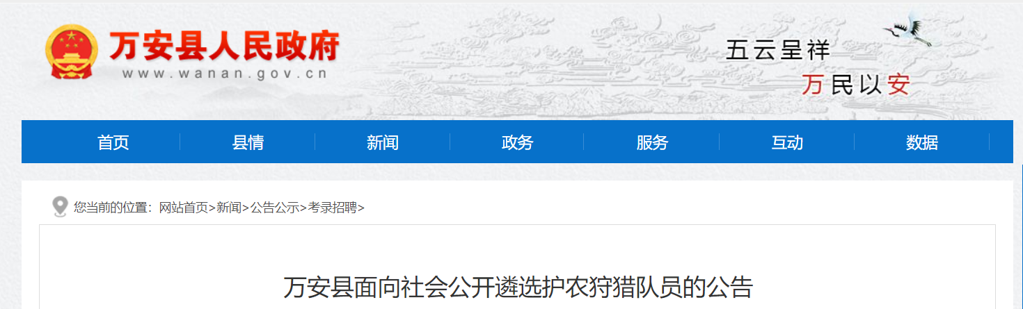 2022江西省吉安市萬安縣遴選護農(nóng)狩獵隊員公告已發(fā)布。報名時間:2022年2月14日至2022年2月18日(上午8:00-12:00 ,下午14:30—17:30)。為您整理了招聘條件和報名流程,供您參考。