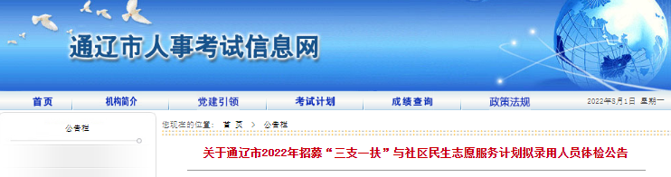 1、通遼市2022年“三支一扶”計(jì)劃擬錄用人員體檢名單及體檢時(shí)間安排表