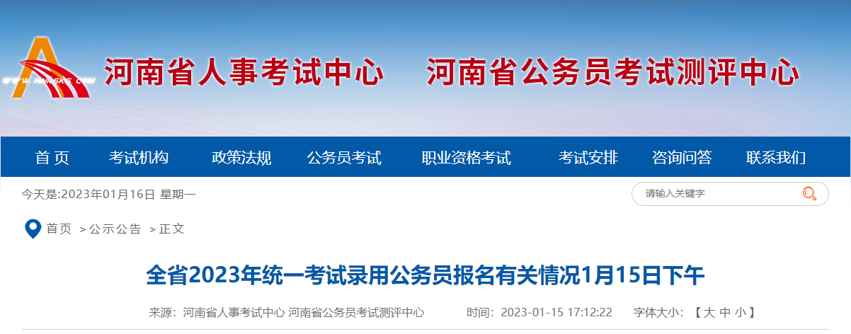 從河南省人事考試中心了解到,截至1月15日下午,2023年河南公務(wù)員報名人數(shù)統(tǒng)計情況如下: