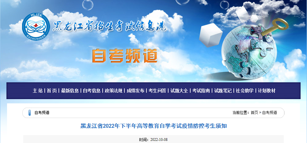 自考頻道從黑龍江省招生考試信息港發(fā)布的《黑龍江省2022年下半年自學(xué)考試疫情防控考生須知》了解到,黑龍江黑河2022年下半年自學(xué)考試時(shí)間是10月22日一25日,詳情如下:
