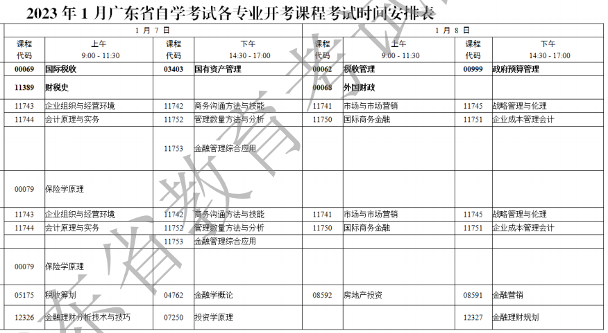 自學(xué)考試頻道根據(jù)廣東省教育考試院公布的《2023年1月廣東省自學(xué)考試開考課程考試時(shí)間安排和使用教材的通知》了解到,2023年1月廣東廣州自考時(shí)間已公布,安排在2023年1月7日至8日期間舉行。詳情如下:
