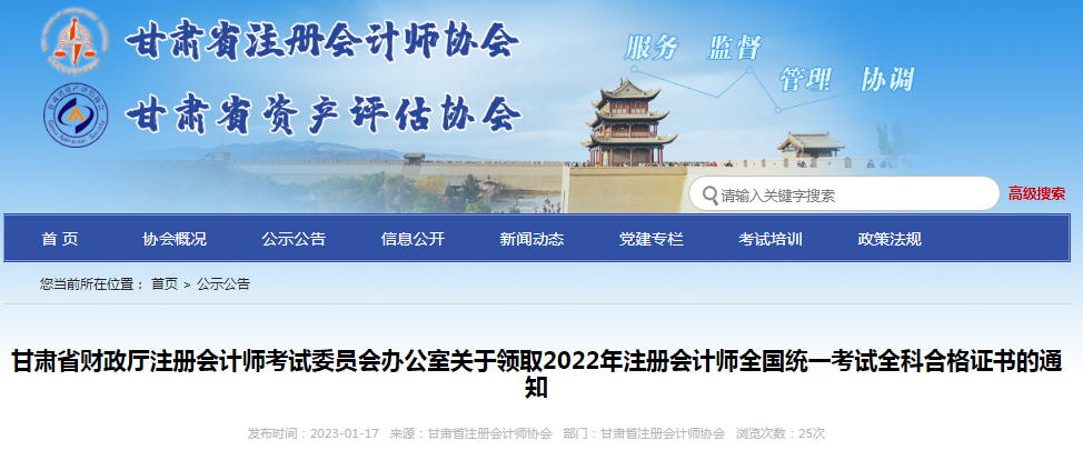 2022年注冊(cè)會(huì)計(jì)師全國(guó)統(tǒng)一考試成績(jī)已于2022年11月21日在中國(guó)注冊(cè)會(huì)計(jì)師協(xié)會(huì)網(wǎng)站公布,現(xiàn)將我省考生領(lǐng)取2022年考試全科合格證書(shū)有關(guān)事項(xiàng)通知如下: