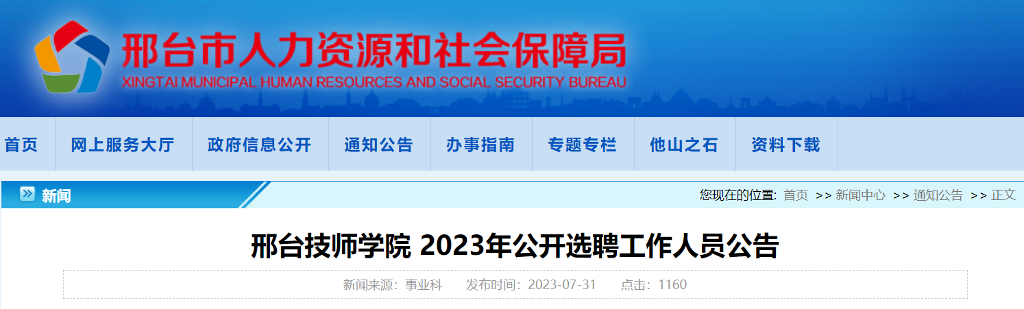 2023年7月31日在邢臺(tái)市人力資源和社會(huì)保障局門戶網(wǎng)站(http://www.hext.lss.gov.cn/)和邢臺(tái)技師學(xué)院網(wǎng)站(http://www.xtjsxy.com/)公開發(fā)布選聘信息。
